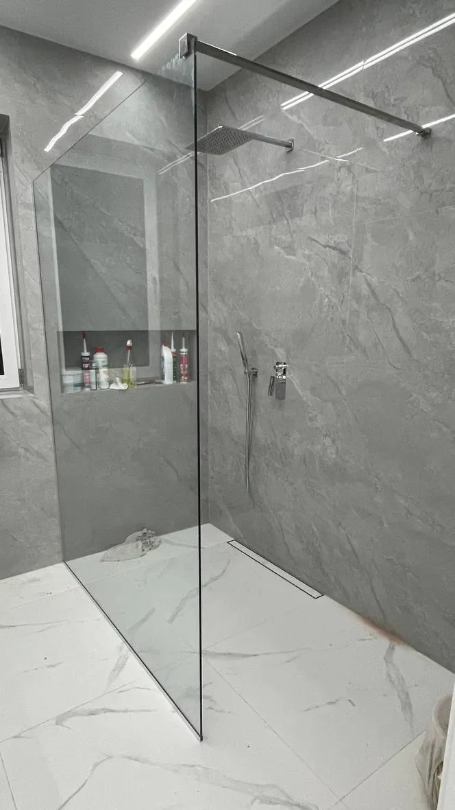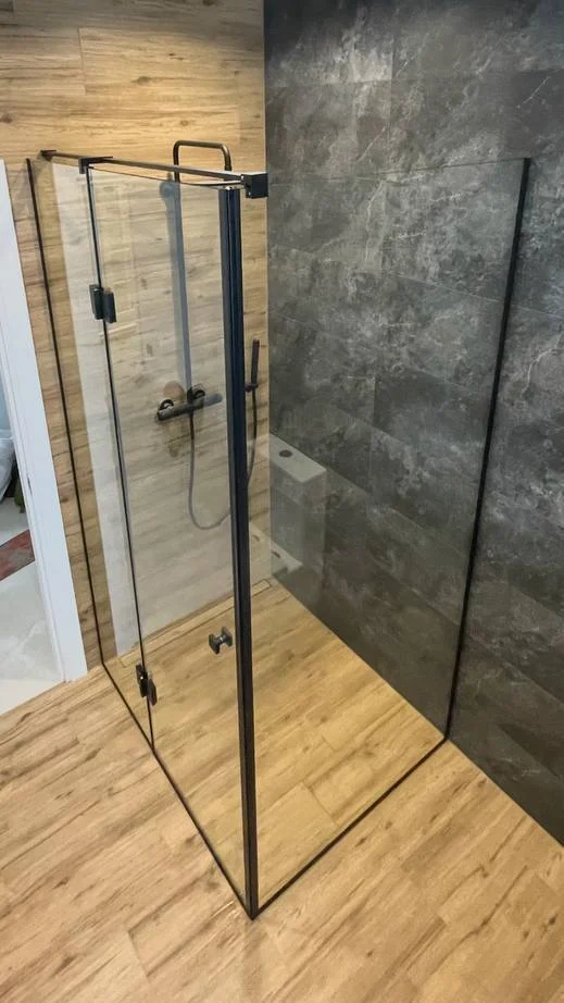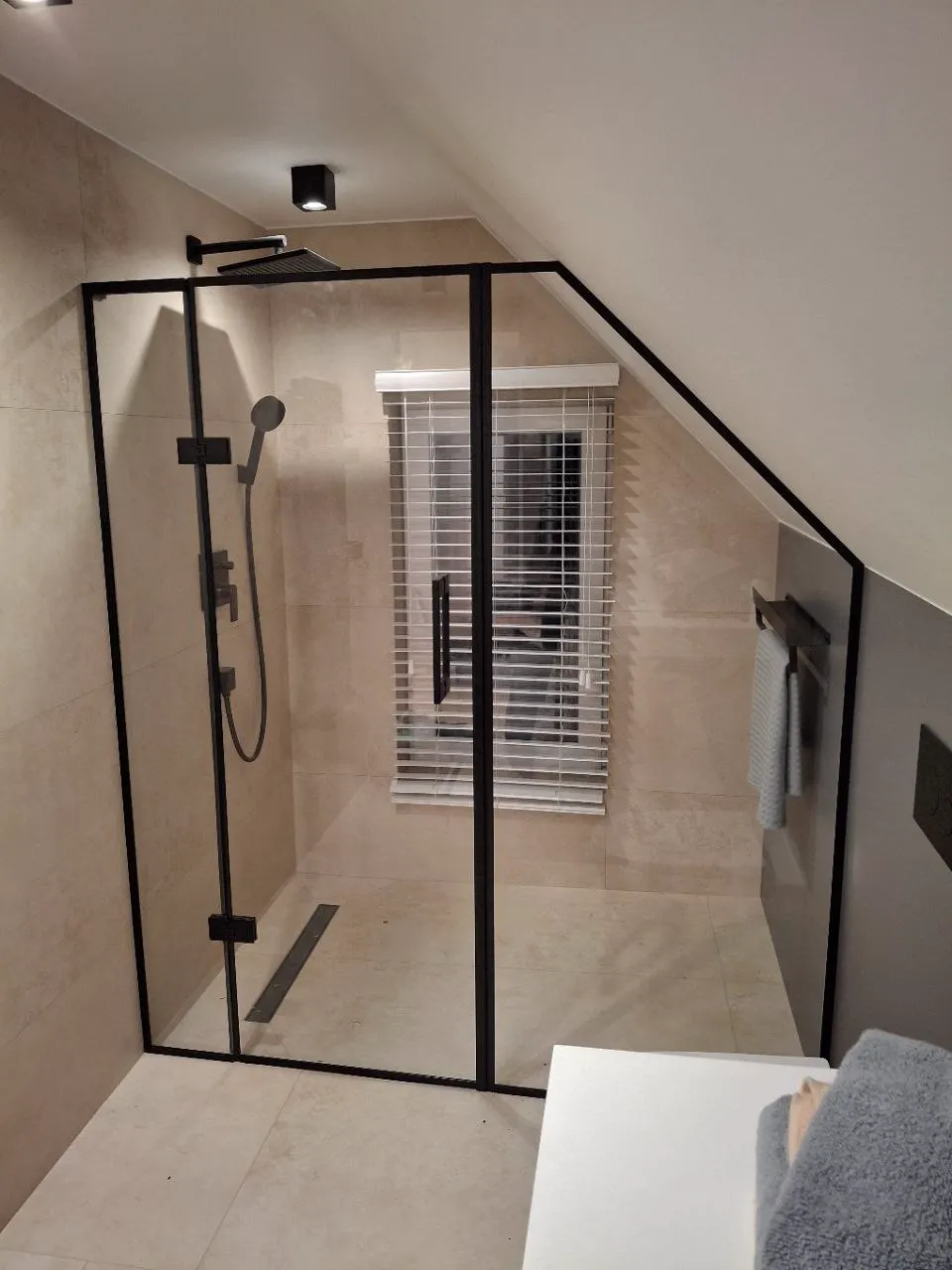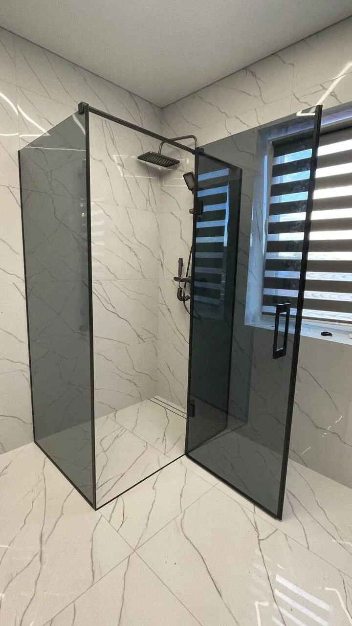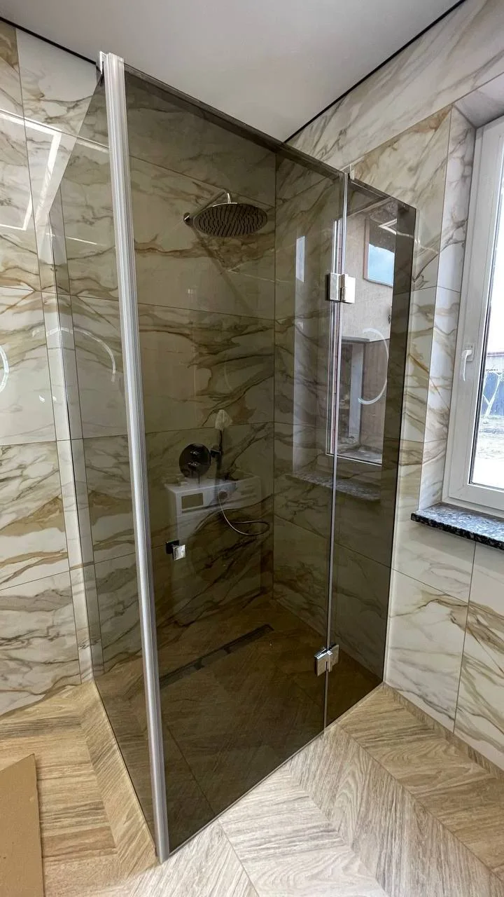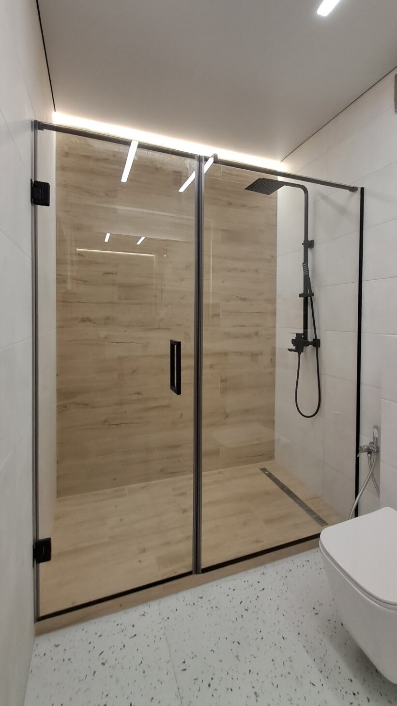 Душова виготовляється точно за розмірами вашого приміщення. Підійде навіть у найскладніші місця: вузькі ніші, перепади стін, скошені стелі або виступи
