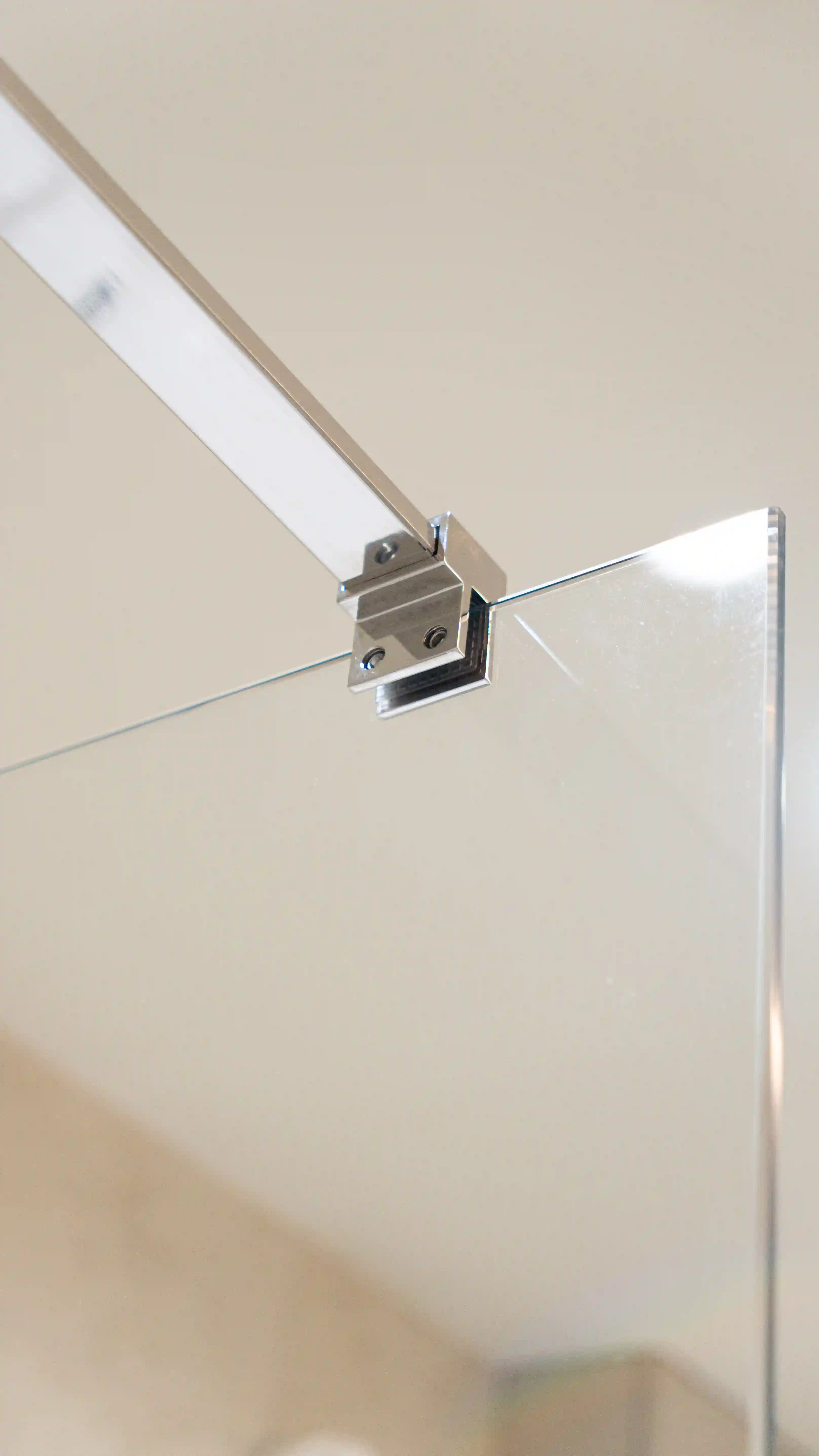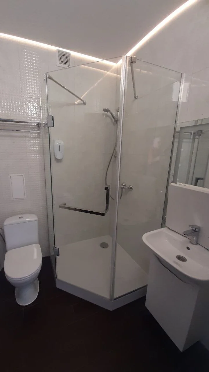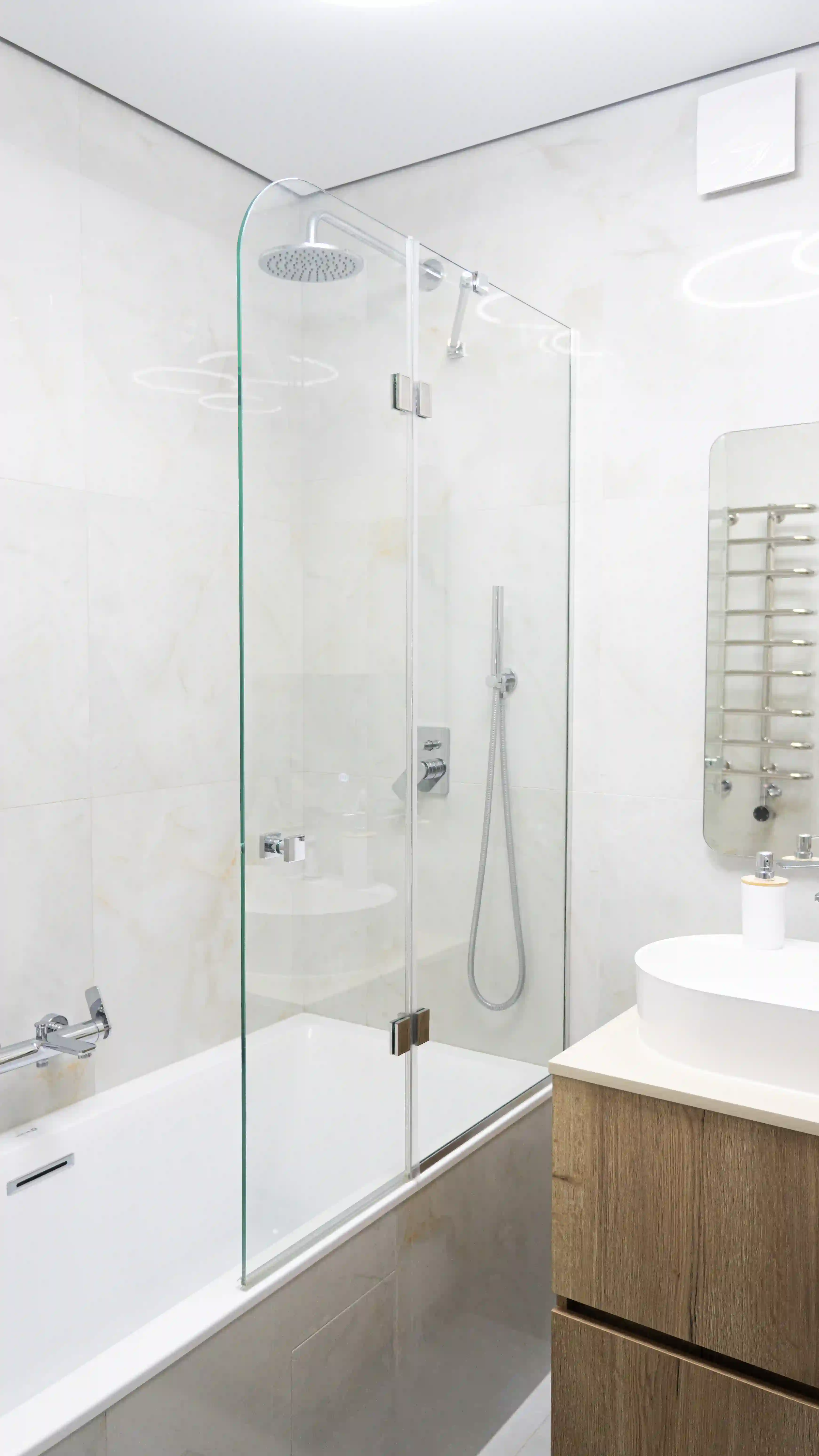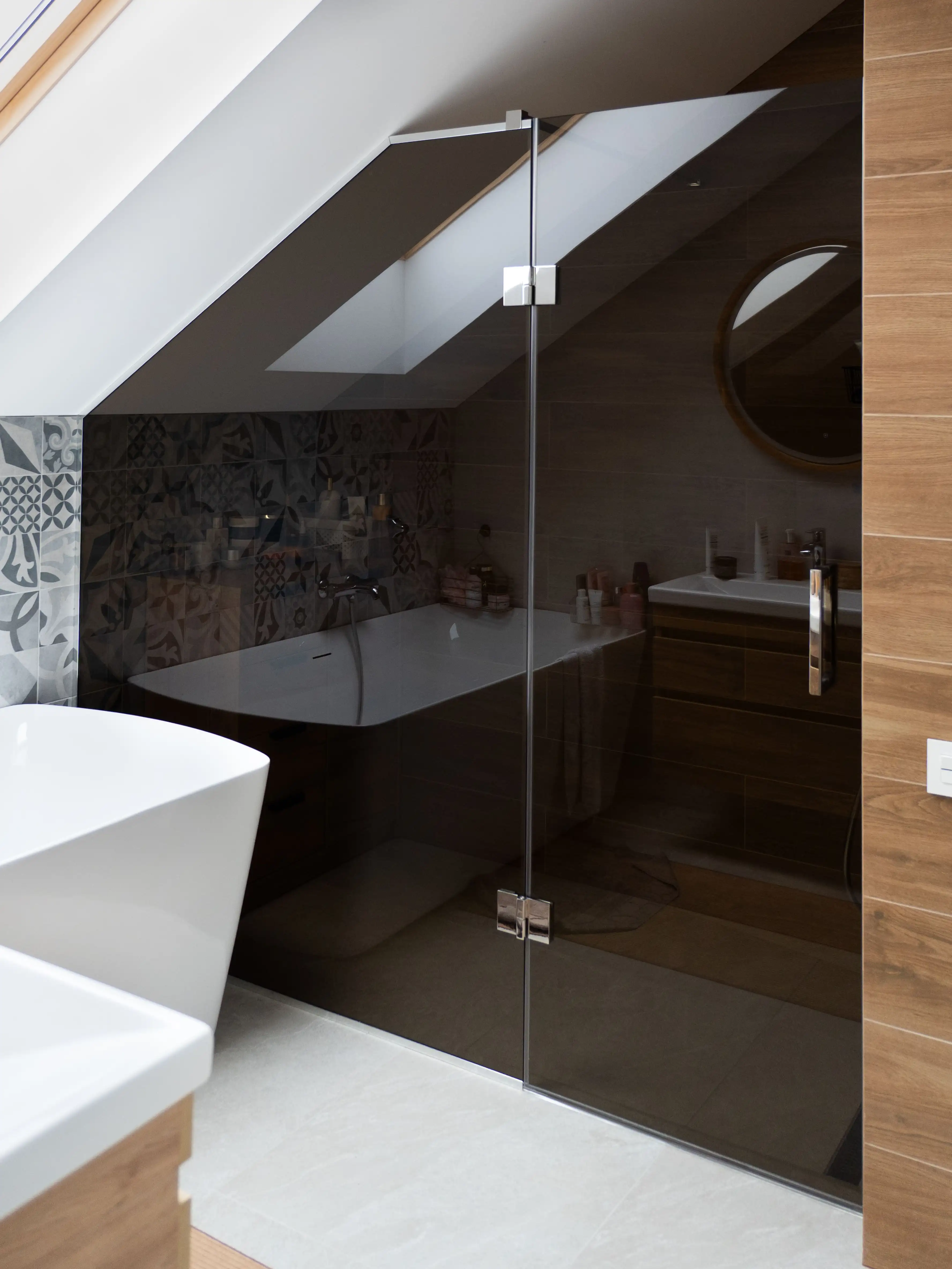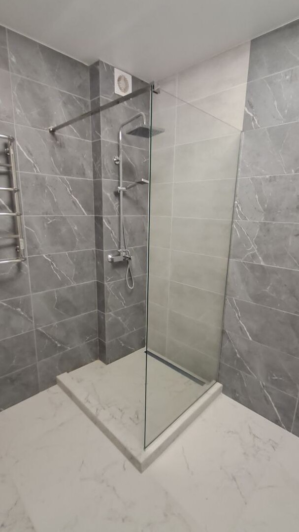 Душова виготовляється точно за розмірами вашого приміщення. Підійде навіть у найскладніші місця: вузькі ніші, перепади стін, скошені стелі або виступи